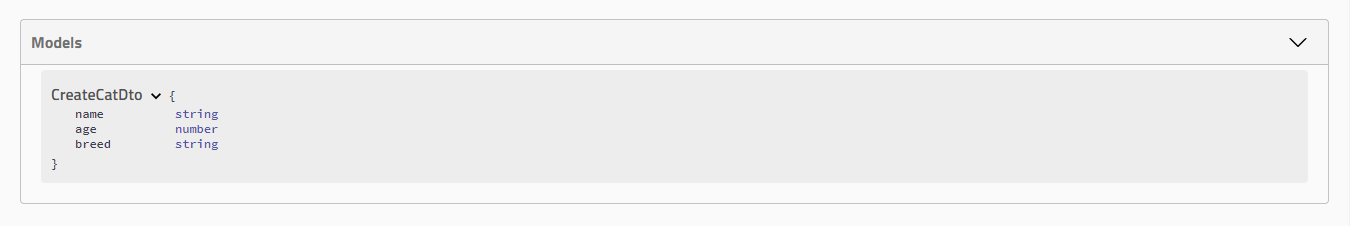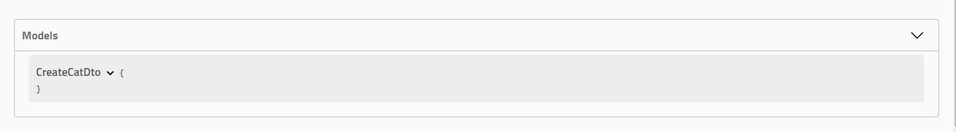 Based on the CreateCatDto, the following model definition Swagger UI will be created: