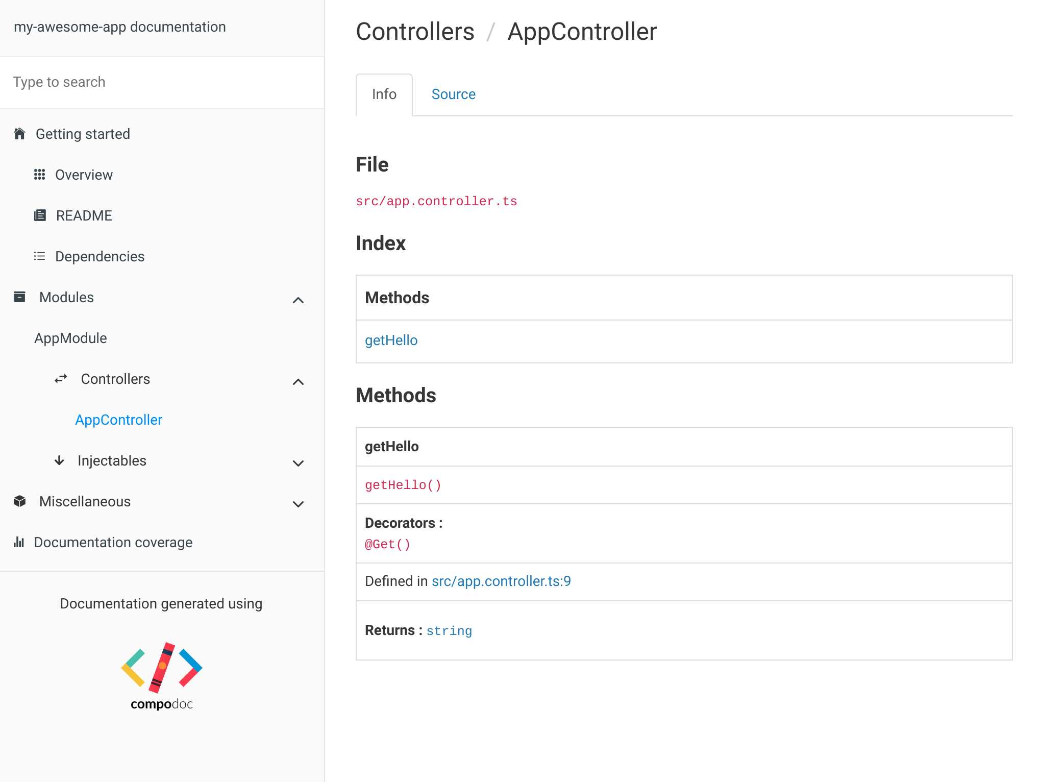 Compodoc is a documentation tool for Angular applications. Since Nest and Angular share similar project and code structures, Compodoc works with Nest applications as well.